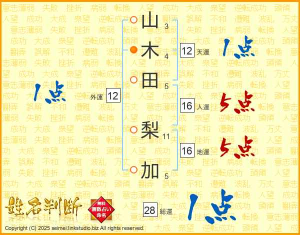 山(3画)木(4画)田(5画) 梨(11画)加(5画)