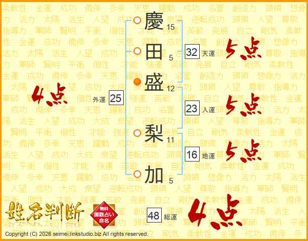 慶(15画)田(5画)盛(12画) 梨(11画)加(5画)