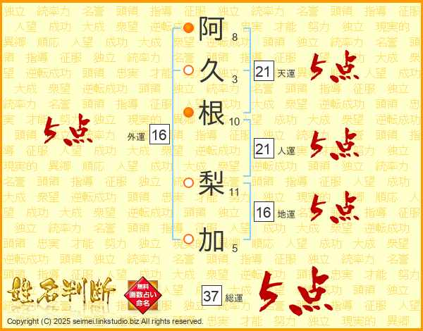 阿(8画)久(3画)根(10画) 梨(11画)加(5画)