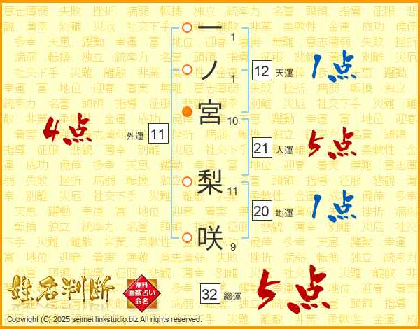 一(1画)ノ(1画)宮(10画) 梨(11画)咲(9画)