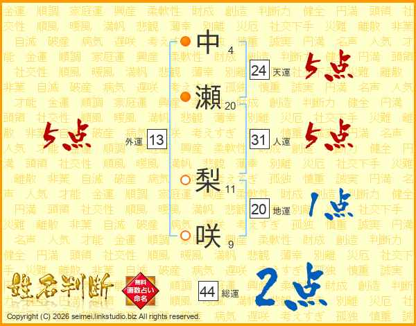 中瀬梨咲さんの総運は44画の2点!