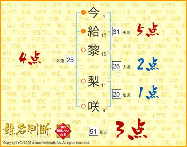今(4画)給(12画)黎(15画) 梨(11画)咲(9画)