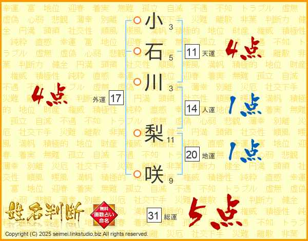 小(3画)石(5画)川(3画) 梨(11画)咲(9画)