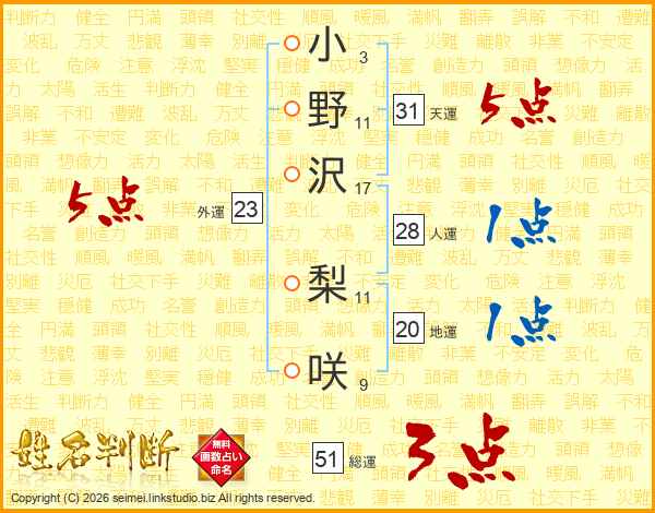 小(3画)野(11画)沢(17画) 梨(11画)咲(9画)