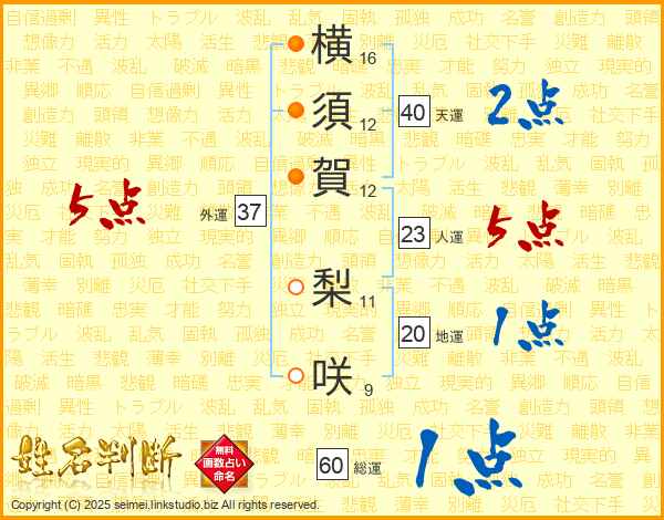 横(16画)須(12画)賀(12画) 梨(11画)咲(9画)