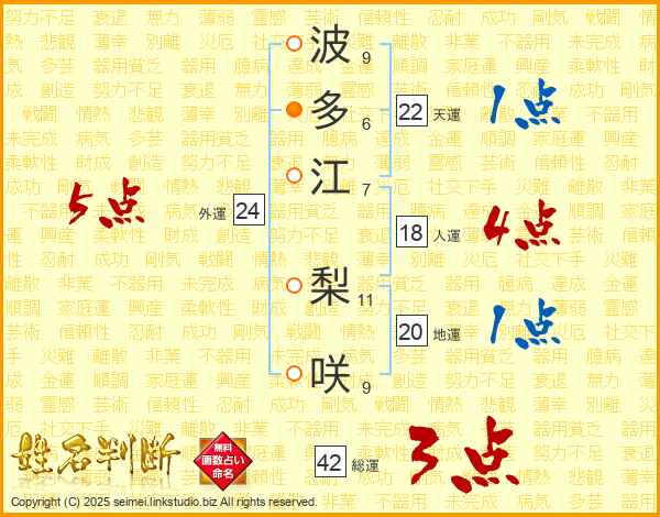 波(9画)多(6画)江(7画) 梨(11画)咲(9画)