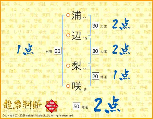 浦(11画)辺(19画) 梨(11画)咲(9画)