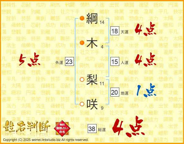 綱(14画)木(4画) 梨(11画)咲(9画)