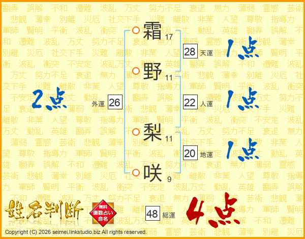 霜(17画)野(11画) 梨(11画)咲(9画)
