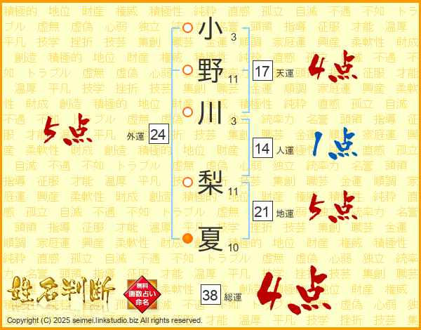 小(3画)野(11画)川(3画) 梨(11画)夏(10画)