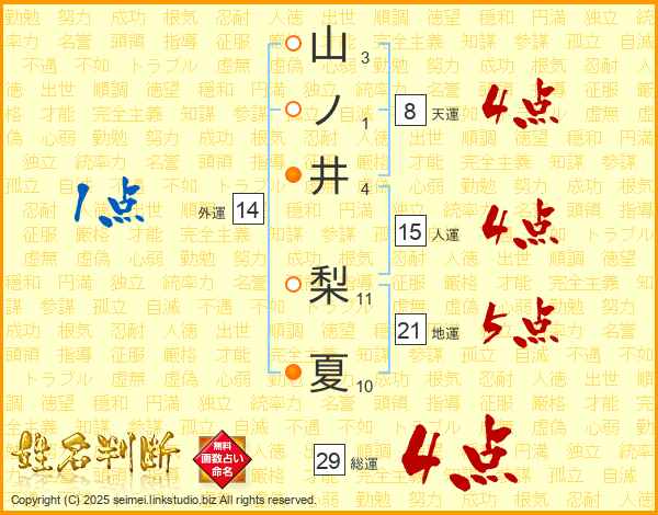 山(3画)ノ(1画)井(4画) 梨(11画)夏(10画)