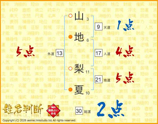 生活面を象徴する運勢です。外部から受ける影響力を表し、結婚運、家庭運や職場、環境への順応性を表します。総運から人運を引いた画数。姓や名が1文字の場合を除く。