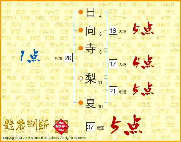 生活面を象徴する運勢です。外部から受ける影響力を表し、結婚運、家庭運や職場、環境への順応性を表します。総運から人運を引いた画数。姓や名が1文字の場合を除く。