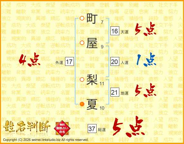 町(7画)屋(9画) 梨(11画)夏(10画)