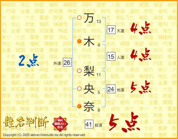 万(13画)木(4画) 梨(11画)央(5画)奈(8画)