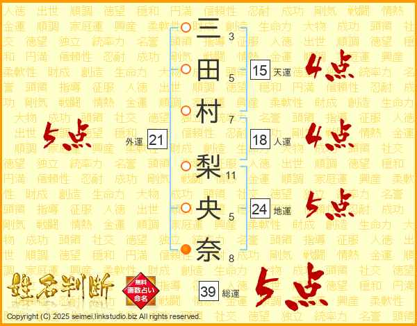 三(3画)田(5画)村(7画) 梨(11画)央(5画)奈(8画)