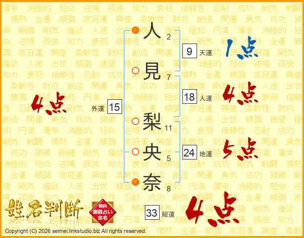 人(2画)見(7画) 梨(11画)央(5画)奈(8画)