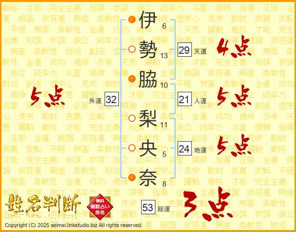 伊(6画)勢(13画)脇(10画) 梨(11画)央(5画)奈(8画)