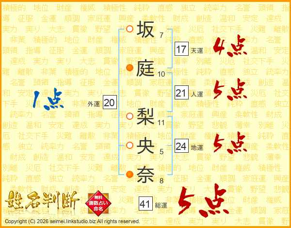 坂庭梨央奈さんの総運は41画の5点!