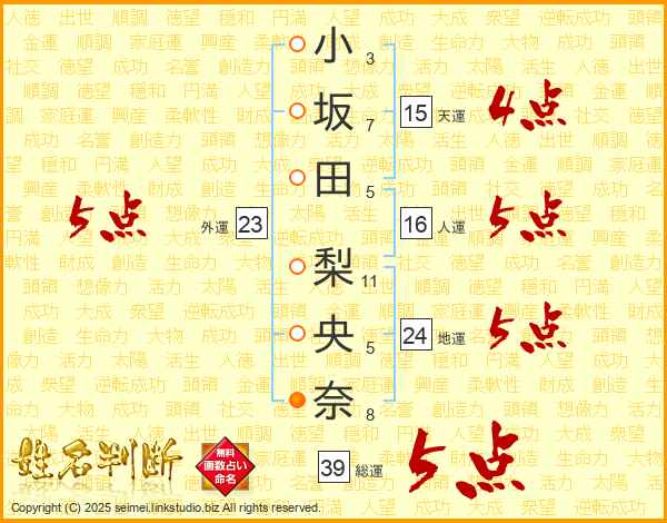 小(3画)坂(7画)田(5画) 梨(11画)央(5画)奈(8画)