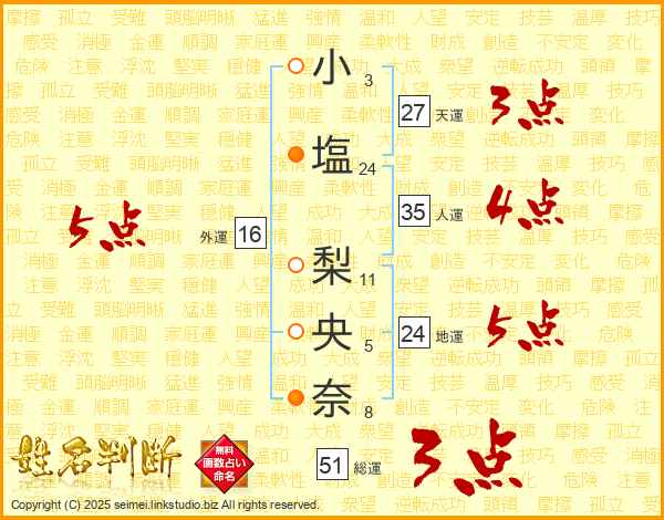 小(3画)塩(24画) 梨(11画)央(5画)奈(8画)