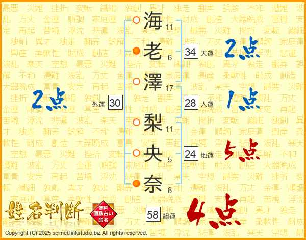 海(11画)老(6画)澤(17画) 梨(11画)央(5画)奈(8画)