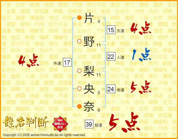 片(4画)野(11画) 梨(11画)央(5画)奈(8画)