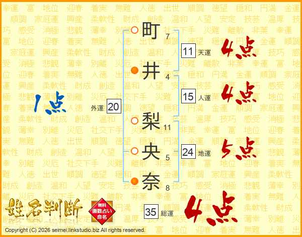 町(7画)井(4画) 梨(11画)央(5画)奈(8画)