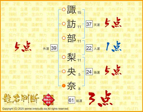 諏(15画)訪(11画)部(11画) 梨(11画)央(5画)奈(8画)