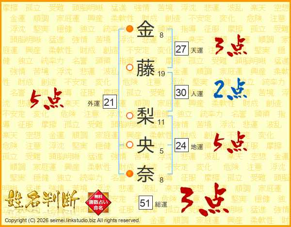 金(8画)藤(19画) 梨(11画)央(5画)奈(8画)