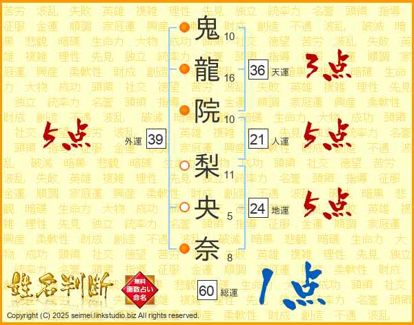 鬼(10画)龍(16画)院(10画) 梨(11画)央(5画)奈(8画)