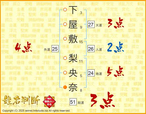 下(3画)屋(9画)敷(15画) 梨(11画)央(5画)奈(8画)
