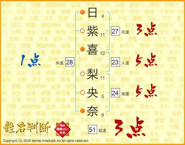 日(4画)紫(11画)喜(12画) 梨(11画)央(5画)奈(8画)
