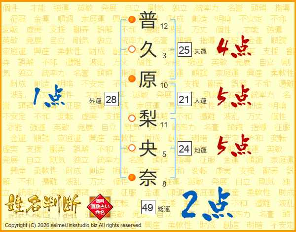 普(12画)久(3画)原(10画) 梨(11画)央(5画)奈(8画)