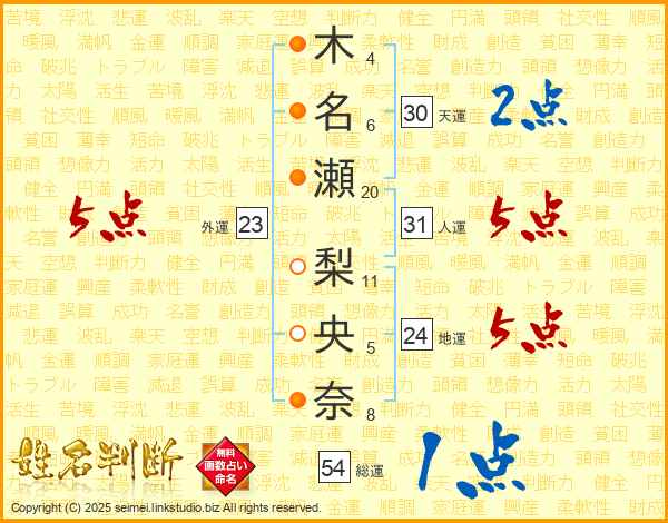 木(4画)名(6画)瀬(20画) 梨(11画)央(5画)奈(8画)