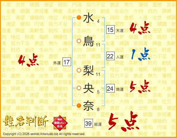 水鳥梨央奈さんの総運は39画の5点!