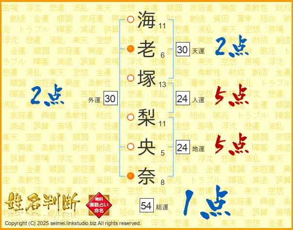 海(11画)老(6画)塚(13画) 梨(11画)央(5画)奈(8画)