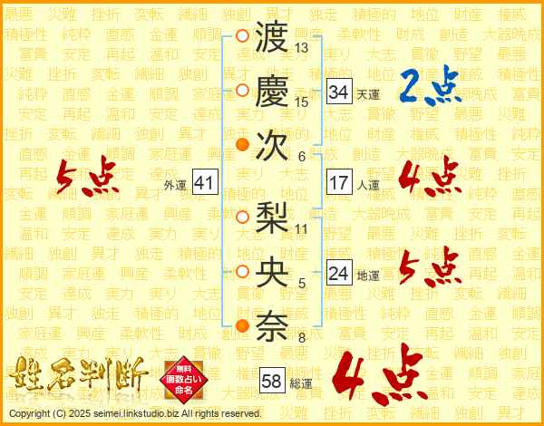 渡(13画)慶(15画)次(6画) 梨(11画)央(5画)奈(8画)