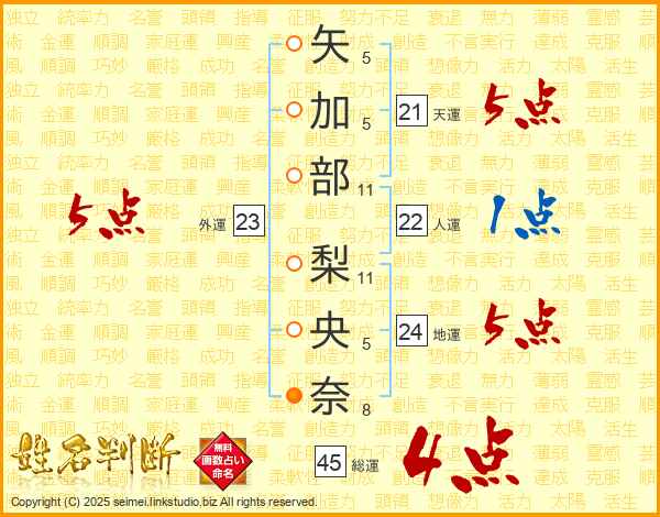 矢(5画)加(5画)部(11画) 梨(11画)央(5画)奈(8画)
