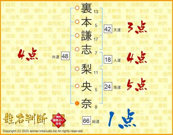 裏(13画)本(5画)謙(17画)志(7画) 梨(11画)央(5画)奈(8画)