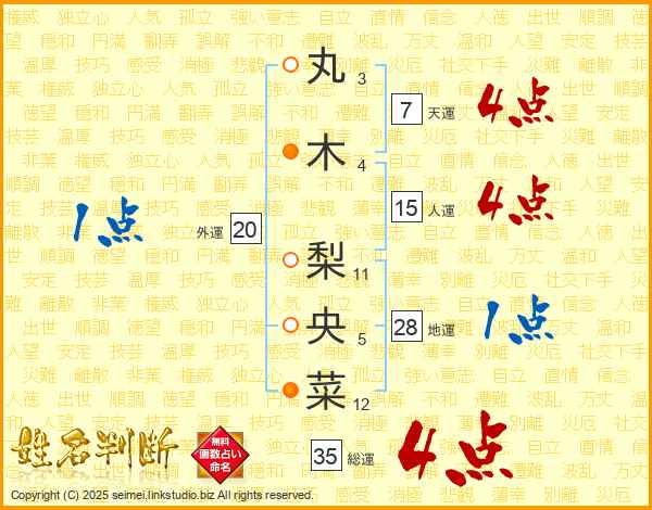 丸(3画)木(4画) 梨(11画)央(5画)菜(12画)