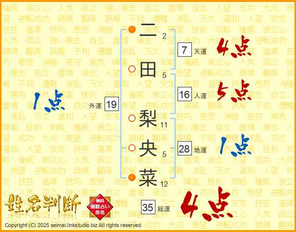 二(2画)田(5画) 梨(11画)央(5画)菜(12画)