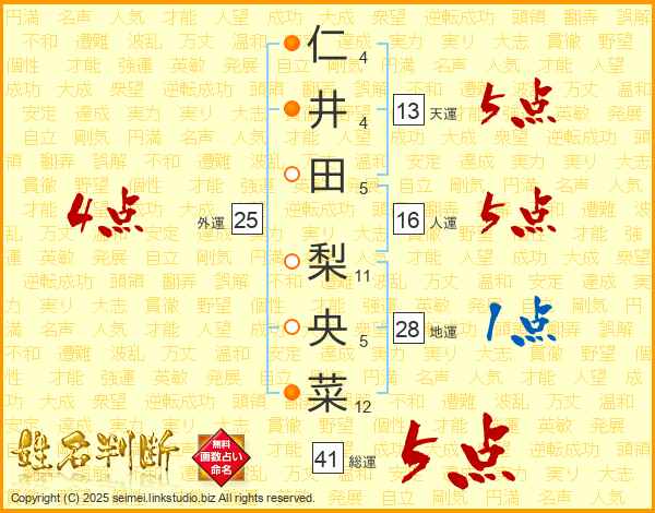 仁(4画)井(4画)田(5画) 梨(11画)央(5画)菜(12画)