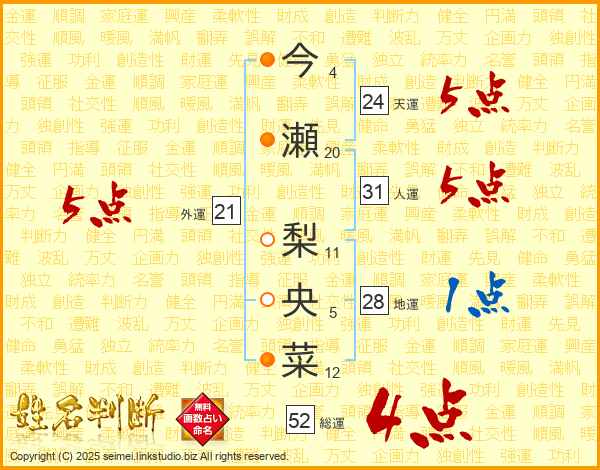 今(4画)瀬(20画) 梨(11画)央(5画)菜(12画)