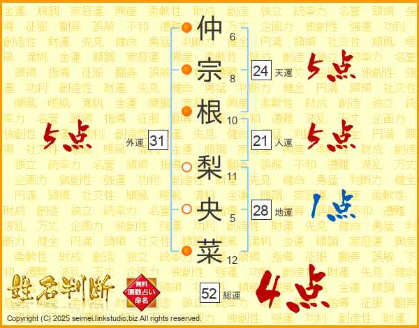 仲宗根梨央菜さんの外運は31画の5点!