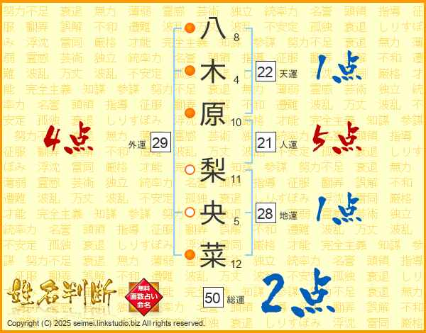 八木原梨央菜さんの人運は21画の5点!