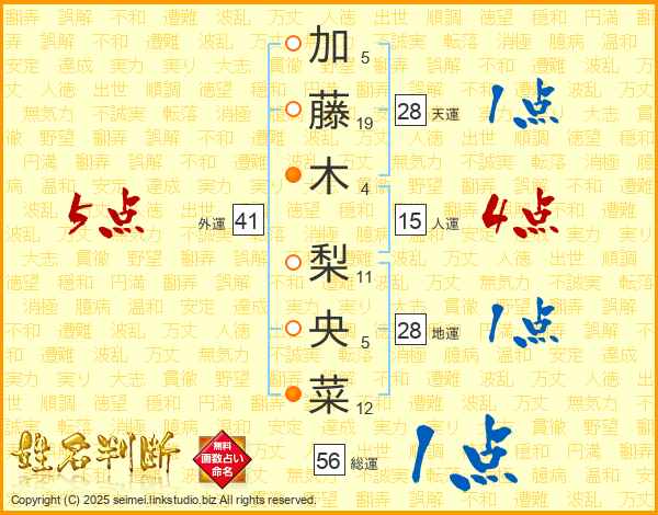 加(5画)藤(19画)木(4画) 梨(11画)央(5画)菜(12画)