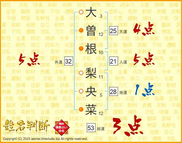 大(3画)曽(12画)根(10画) 梨(11画)央(5画)菜(12画)