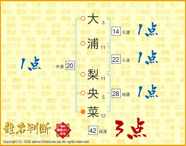 大(3画)浦(11画) 梨(11画)央(5画)菜(12画)