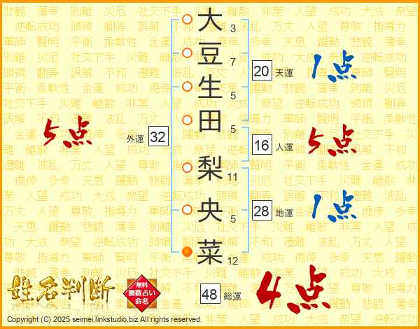 大(3画)豆(7画)生(5画)田(5画) 梨(11画)央(5画)菜(12画)